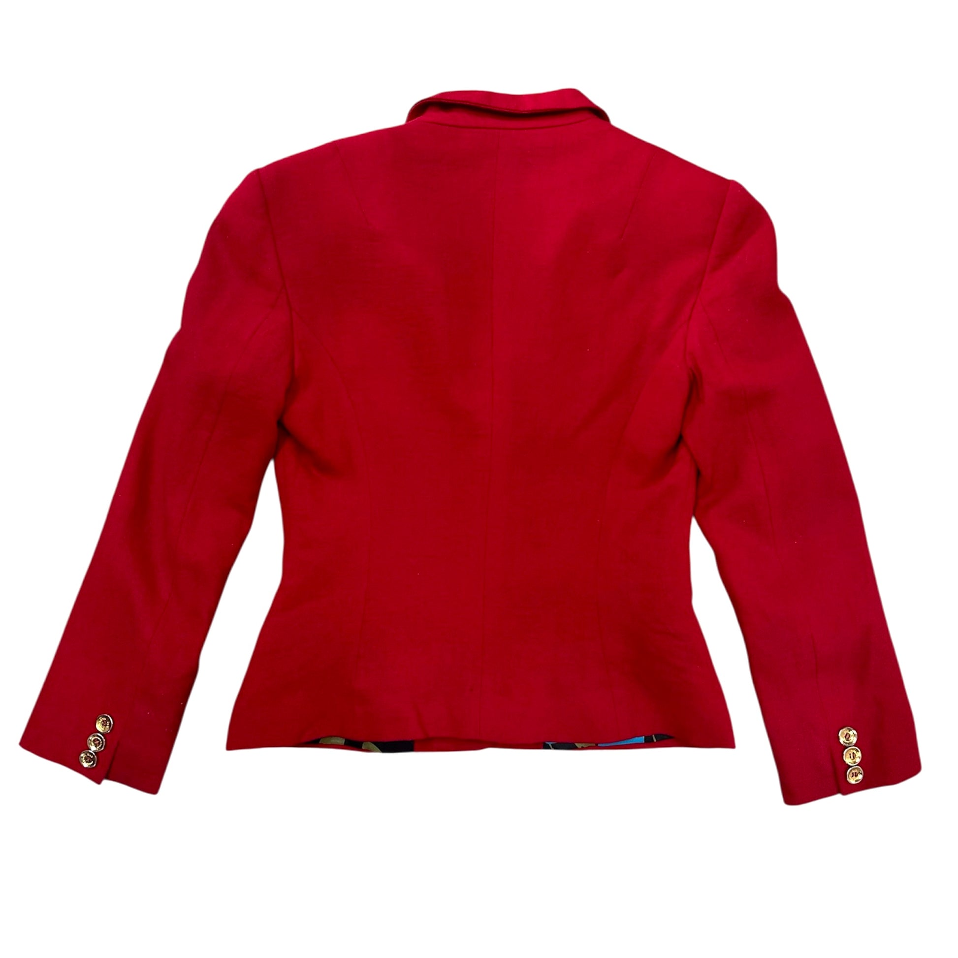 Questo elegante blazer rosso di Dolce & Gabbana, taglia 40, è un capo distintivo che unisce stile classico e dettagli lussuosi.