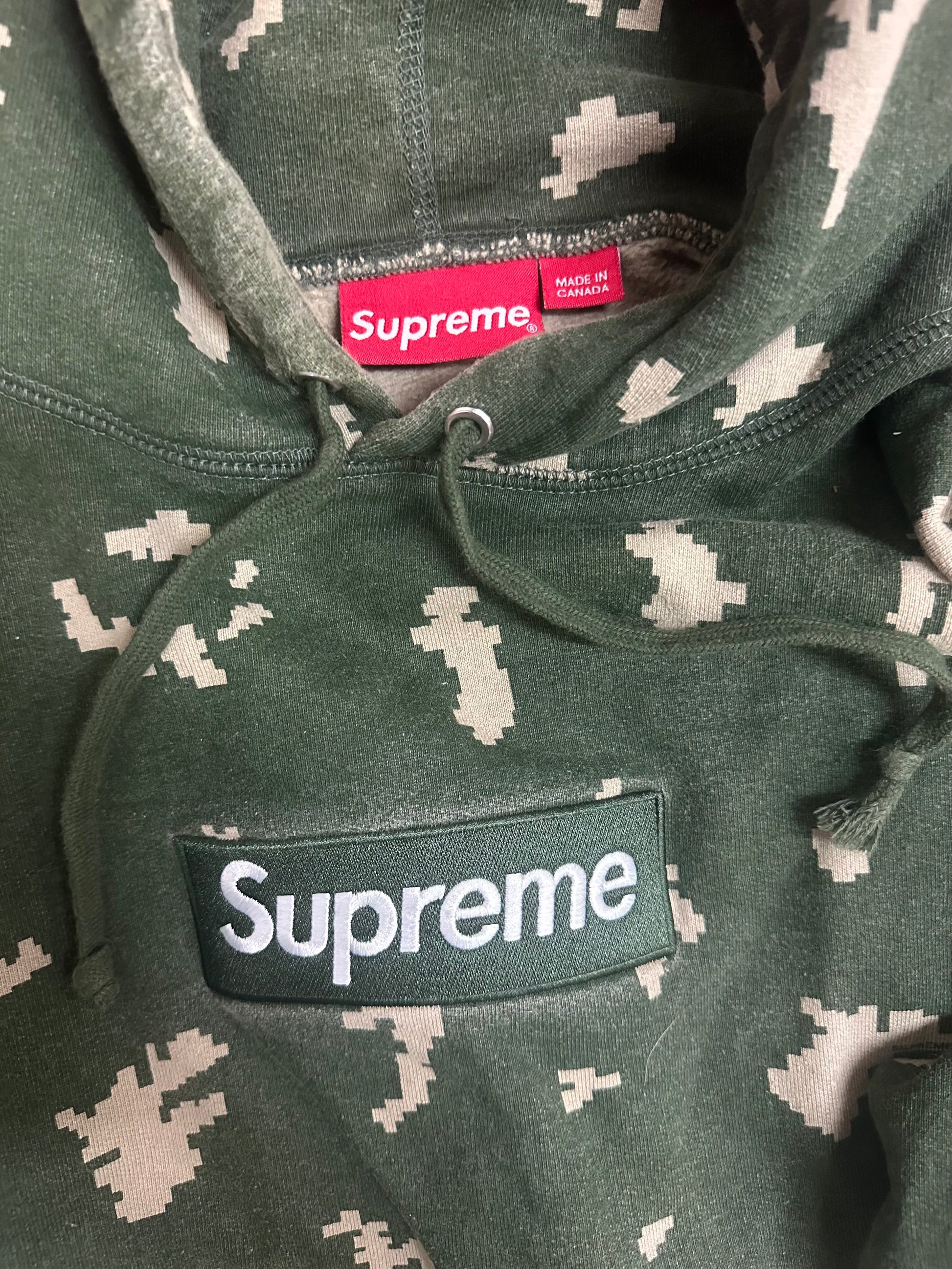Aggiungi un tocco iconico al tuo guardaroba con questa autentica felpa con cappuccio Supreme Box Logo. Caratterizzata da una distintiva stampa mimetica digitale verde e beige, questa felpa offre un look audace e riconoscibile. Il classico logo Supreme Box è posizionato centralmente sul petto, garantendo un'immediata riconoscibilità del marchio. Realizzata in cotone pesante, offre comfort e calore, perfetta per le stagioni più fresche o per un look casual di tendenza.