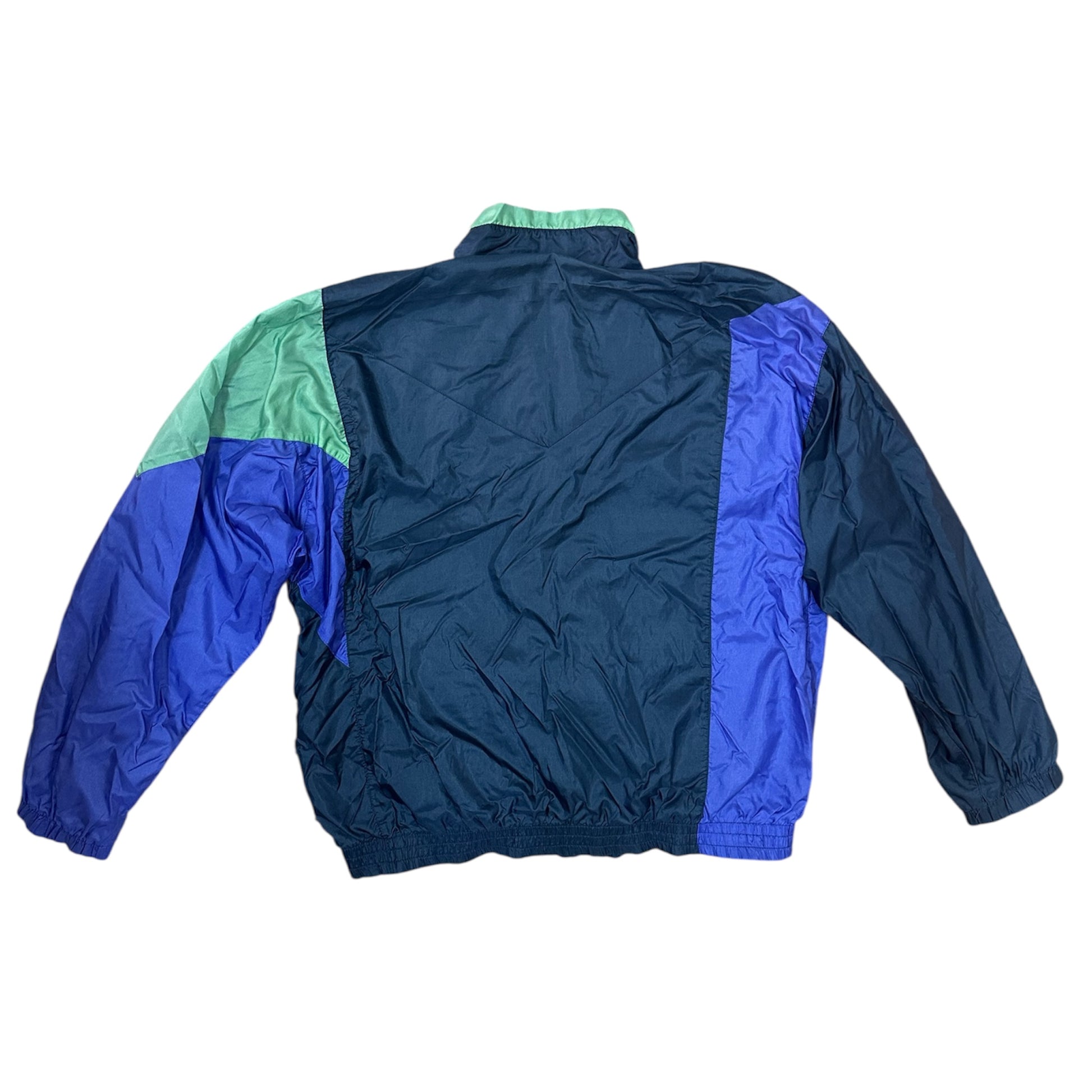 Rivivi l'iconico stile anni '90 con questa autentica giacca a vento Nike, un pezzo unico e imperdibile per gli amanti del vintage e dello streetwear. Caratterizzata da un design color-block audace e vibrante, questa giacca combina tonalità di blu scuro, viola e verde menta per un look inconfondibile che cattura l'essenza di un decennio.