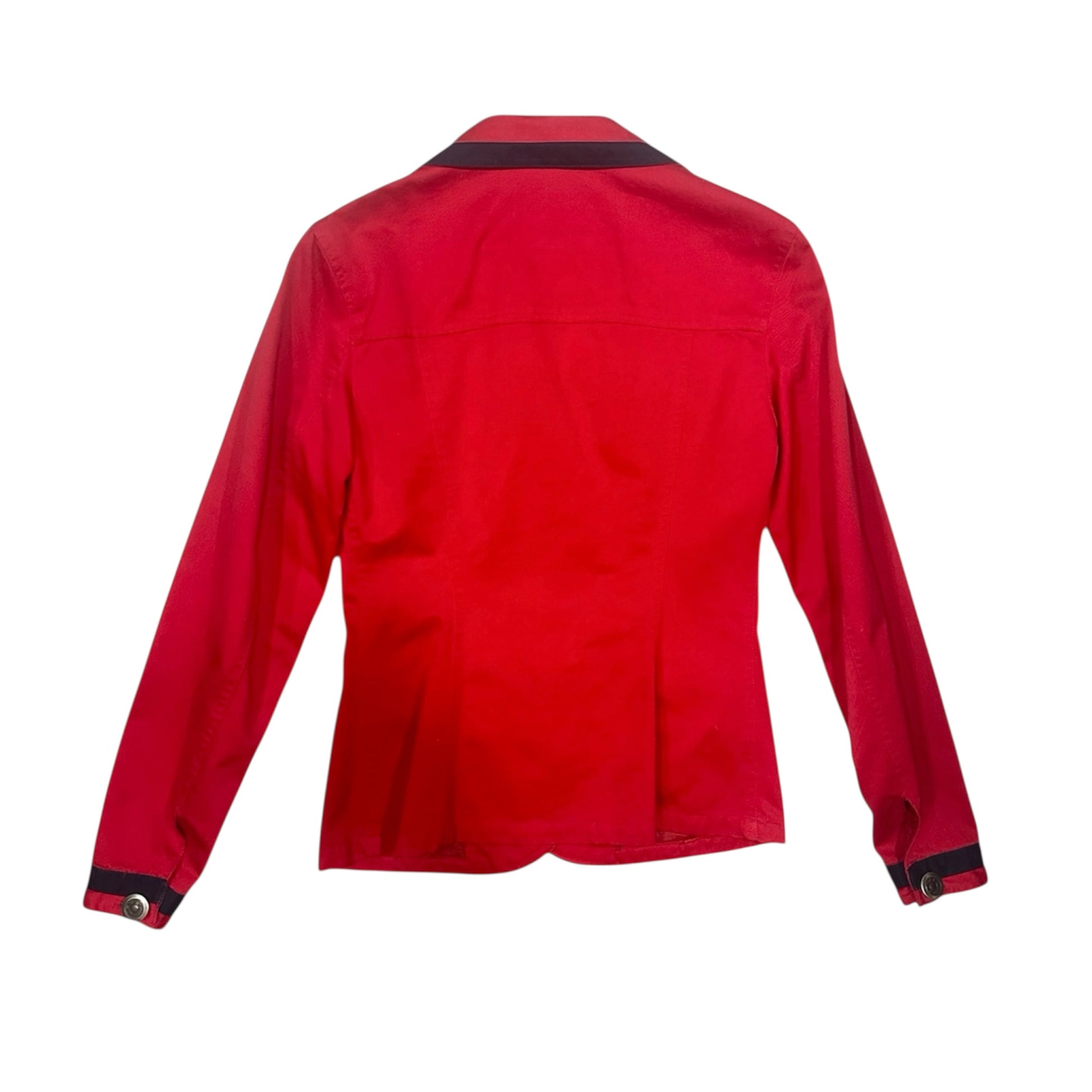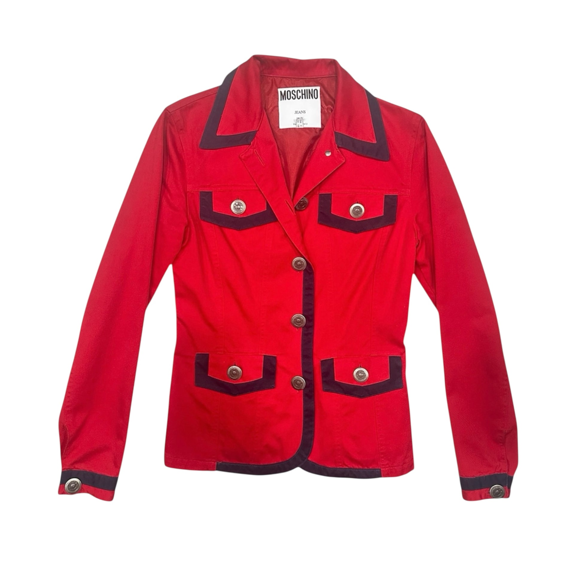 Questa giacca firmata Moschino Jeans è un autentico pezzo vintage dal carattere deciso e dallo stile inconfondibile. Realizzata in un vivace rosso acceso, è impreziosita da dettagli in contrasto di colore nero che delineano colletto, profili delle tasche e bordo frontale, creando un look grafico e d’impatto.